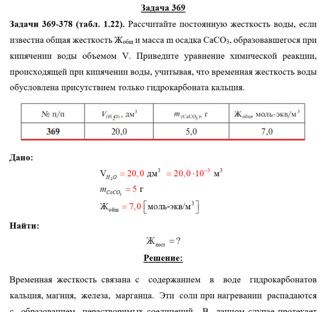 Задача 369 - Рассчитайте постоянную жесткость воды, если известна общая жесткость Жобщ и масса m осадка CaCO3, образовавшегося при кипячении воды объемом V. Приведите уравнение химической реакции, происходящей при кипячении воды, учитывая, что времен