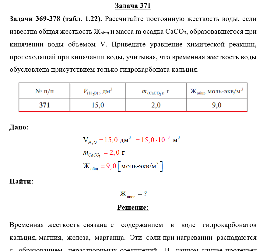 Задача 371 - Рассчитайте постоянную жесткость воды, если известна общая жесткость Жобщ и масса m осадка CaCO3, образовавшегося при кипячении воды объемом V. Приведите уравнение химической реакции, происходящей при кипячении воды, учитывая, что времен