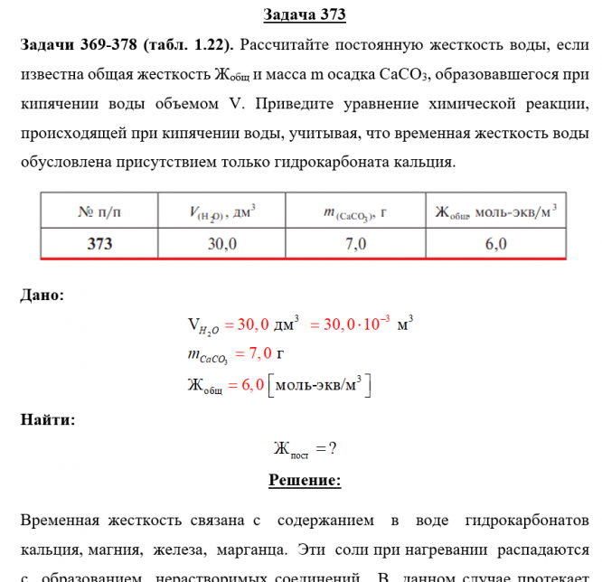 Задача 373 - Рассчитайте постоянную жесткость воды, если известна общая жесткость Жобщ и масса m осадка CaCO3, образовавшегося при кипячении воды объемом V. Приведите уравнение химической реакции, происходящей при кипячении воды, учитывая, что времен