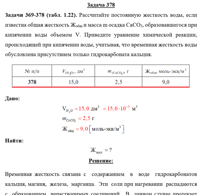 Задача 378 - Рассчитайте постоянную жесткость воды, если известна общая жесткость Жобщ и масса m осадка CaCO3, образовавшегося при кипячении воды объемом V. Приведите уравнение химической реакции, происходящей при кипячении воды, учитывая, что времен