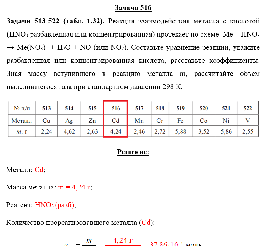 Задачи 513-522 (табл. 1.32). Реакция взаимодействия металла с кислотой (HNO3 разбавленная или концентрированная) протекает по схеме: Ме + HNO3 → Ме(NO3)x + H2O + NO (или NO2). Составьте уравнение реакции, укажите разбавленная или концентрированная кислота, расставьте коэффициенты. Зная массу вступившего в реакцию металла m, рассчитайте объем выделившегося газа при стандартном давлении 298 К.