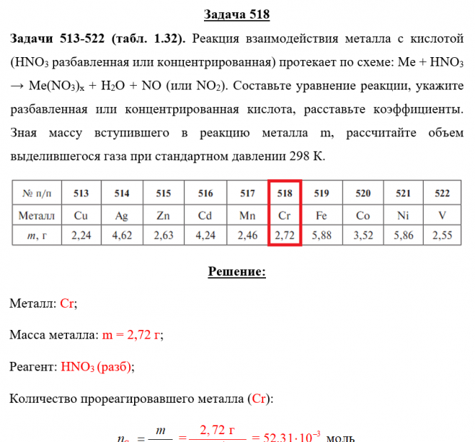 Задачи 513-522 (табл. 1.32). Реакция взаимодействия металла с кислотой (HNO3 разбавленная или концентрированная) протекает по схеме: Ме + HNO3 → Ме(NO3)x + H2O + NO (или NO2). Составьте уравнение реакции, укажите разбавленная или концентрированная кислота, расставьте коэффициенты. Зная массу вступившего в реакцию металла m, рассчитайте объем выделившегося газа при стандартном давлении 298 К.