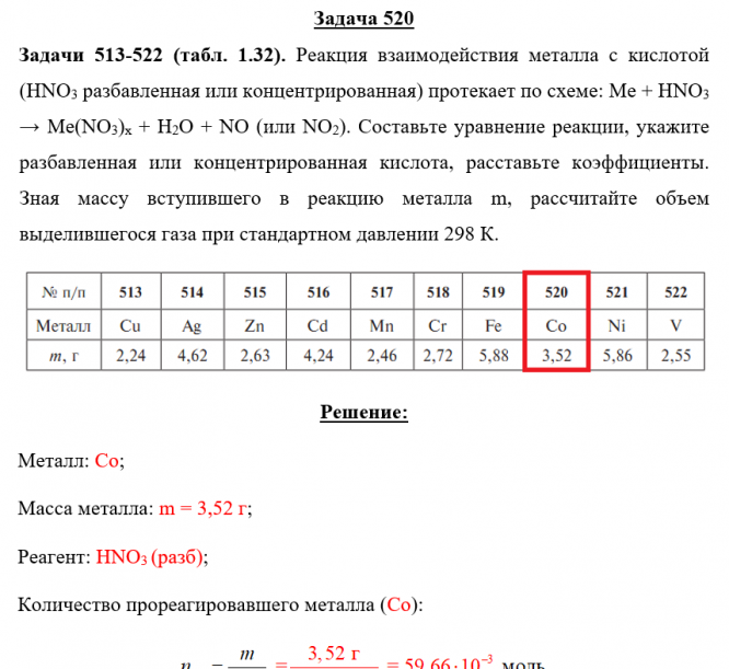 Задачи 513-522 (табл. 1.32). Реакция взаимодействия металла с кислотой (HNO3 разбавленная или концентрированная) протекает по схеме: Ме + HNO3 → Ме(NO3)x + H2O + NO (или NO2). Составьте уравнение реакции, укажите разбавленная или концентрированная кислота, расставьте коэффициенты. Зная массу вступившего в реакцию металла m, рассчитайте объем выделившегося газа при стандартном давлении 298 К.
