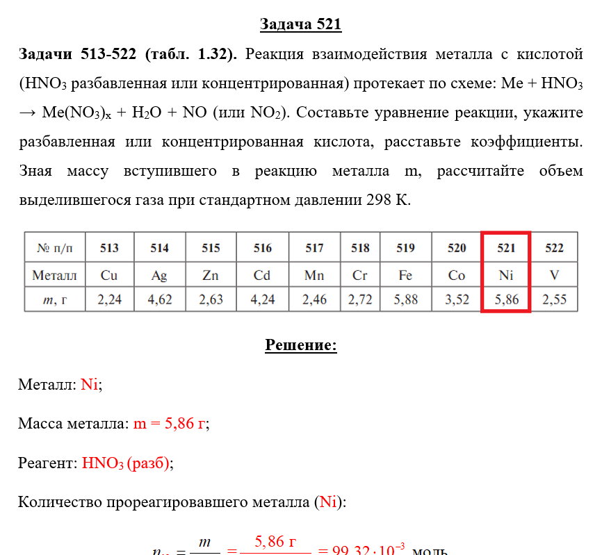 Задачи 513-522 (табл. 1.32). Реакция взаимодействия металла с кислотой (HNO3 разбавленная или концентрированная) протекает по схеме: Ме + HNO3 → Ме(NO3)x + H2O + NO (или NO2). Составьте уравнение реакции, укажите разбавленная или концентрированная кислота, расставьте коэффициенты. Зная массу вступившего в реакцию металла m, рассчитайте объем выделившегося газа при стандартном давлении 298 К.