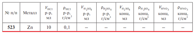 Задачи 523-542 (табл. 1.33). Напишите уравнение реакции взаимодействия металла с кислотой. Рассчитайте массу вступившего в реакцию металла и объем выделившегося газа (н.у.) по известному объему V вступившей в реакцию кислоты и ее плотности ρ. Примечание. Обратите внимание на концентрацию кислоты!.