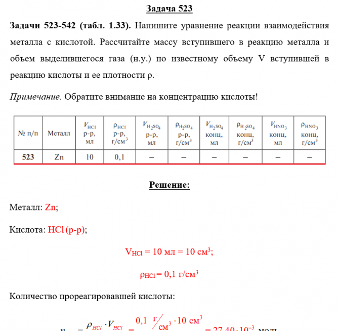 Задача 523 - Напишите уравнение реакции взаимодействия металла с кислотой. Рассчитайте массу вступившего в реакцию металла и объем выделившегося газа (н.у.) по известному объему V вступившей в реакцию кислоты и ее плотности ρ. Примечание. Обратите вн