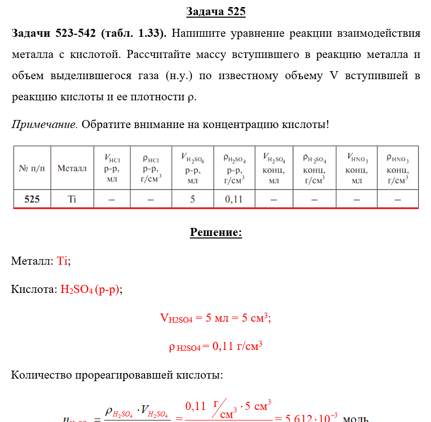 Задачи 523-542 (табл. 1.33). Напишите уравнение реакции взаимодействия металла с кислотой. Рассчитайте массу вступившего в реакцию металла и объем выделившегося газа (н.у.) по известному объему V вступившей в реакцию кислоты и ее плотности ρ. Примечание. Обратите внимание на концентрацию кислоты!.