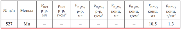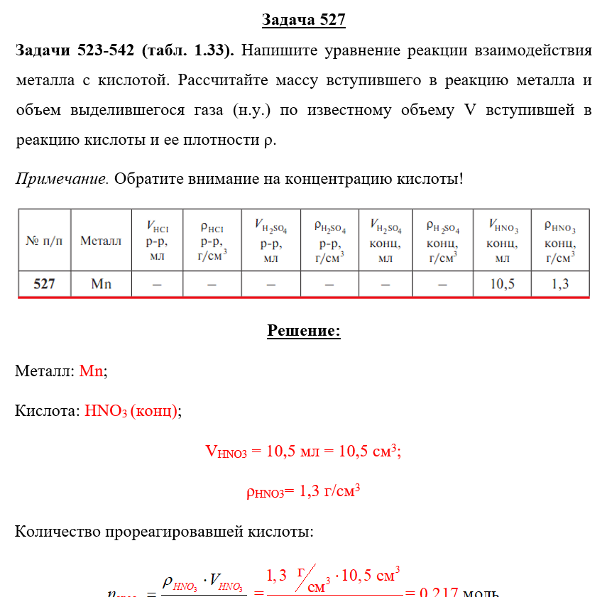 Задачи 523-542 (табл. 1.33). Напишите уравнение реакции взаимодействия металла с кислотой. Рассчитайте массу вступившего в реакцию металла и объем выделившегося газа (н.у.) по известному объему V вступившей в реакцию кислоты и ее плотности ρ. Примечание. Обратите внимание на концентрацию кислоты!.