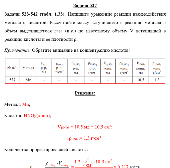 Задача 527 - Напишите уравнение реакции взаимодействия металла с кислотой. Рассчитайте массу вступившего в реакцию металла и объем выделившегося газа (н.у.) по известному объему V вступившей в реакцию кислоты и ее плотности ρ. Примечание. Обратите вн