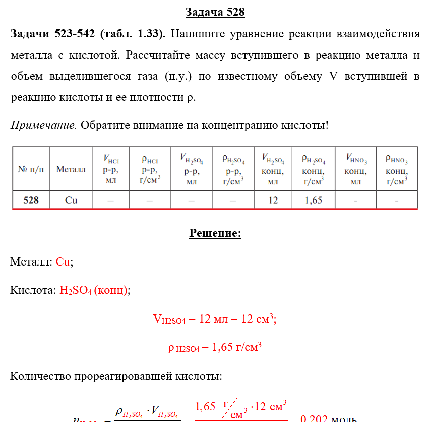 Задачи 523-542 (табл. 1.33). Напишите уравнение реакции взаимодействия металла с кислотой. Рассчитайте массу вступившего в реакцию металла и объем выделившегося газа (н.у.) по известному объему V вступившей в реакцию кислоты и ее плотности ρ. Примечание. Обратите внимание на концентрацию кислоты!.