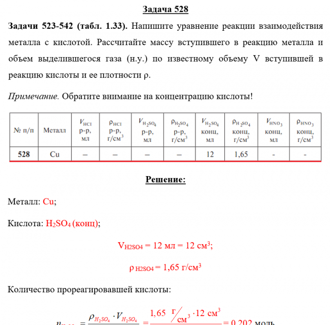 Задача 528 - Напишите уравнение реакции взаимодействия металла с кислотой. Рассчитайте массу вступившего в реакцию металла и объем выделившегося газа (н.у.) по известному объему V вступившей в реакцию кислоты и ее плотности ρ. Примечание. Обратите вн