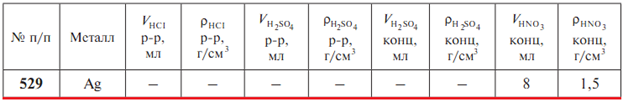 Задачи 523-542 (табл. 1.33). Напишите уравнение реакции взаимодействия металла с кислотой. Рассчитайте массу вступившего в реакцию металла и объем выделившегося газа (н.у.) по известному объему V вступившей в реакцию кислоты и ее плотности ρ. Примечание. Обратите внимание на концентрацию кислоты!.