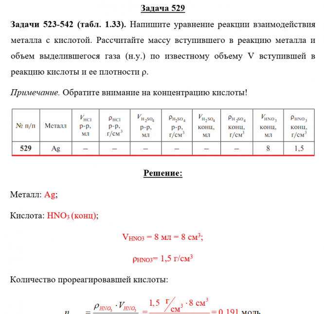Задача 529 - Напишите уравнение реакции взаимодействия металла с кислотой. Рассчитайте массу вступившего в реакцию металла и объем выделившегося газа (н.у.) по известному объему V вступившей в реакцию кислоты и ее плотности ρ. Примечание. Обратите вн