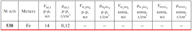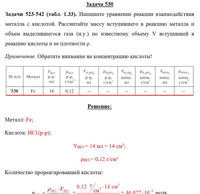 Задача 530 - Напишите уравнение реакции взаимодействия металла с кислотой. Рассчитайте массу вступившего в реакцию металла и объем выделившегося газа (н.у.) по известному объему V вступившей в реакцию кислоты и ее плотности ρ. Примечание. Обратите вн