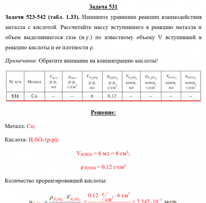 Задача 531 - Напишите уравнение реакции взаимодействия металла с кислотой. Рассчитайте массу вступившего в реакцию металла и объем выделившегося газа (н.у.) по известному объему V вступившей в реакцию кислоты и ее плотности ρ. Примечание. Обратите вн