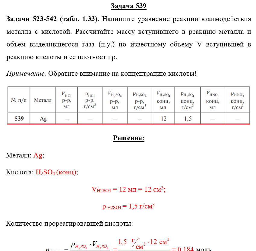 Задачи 523-542 (табл. 1.33). Напишите уравнение реакции взаимодействия металла с кислотой. Рассчитайте массу вступившего в реакцию металла и объем выделившегося газа (н.у.) по известному объему V вступившей в реакцию кислоты и ее плотности ρ. Примечание. Обратите внимание на концентрацию кислоты!.