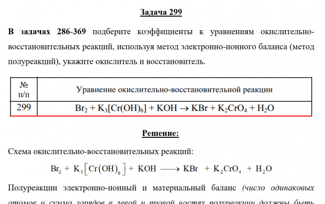 Задача 299 - подберите коэффициенты к уравнениям окислительно-восстановительных реакций, используя метод электронно-ионного баланса (метод полуреакций), укажите окислитель и восстановитель.