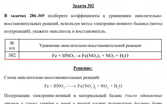 Задача 302 - подберите коэффициенты к уравнениям окислительно-восстановительных реакций, используя метод электронно-ионного баланса (метод полуреакций), укажите окислитель и восстановитель.