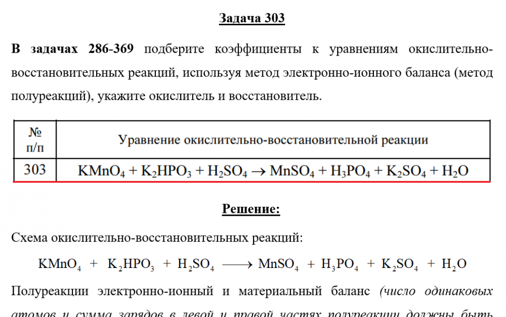 Для студентов по предмету ХимияЗадача 303 - подберите коэффициенты к уравнениям окислительно-восстановительных реакций, используя метод электронно-ионного баланса (метод полуреакцийЗадача 303 - подберите коэффициенты к уравнениям окислительно-восстановительных реакций, используя метод электронно-ионного баланса (метод полуреакций