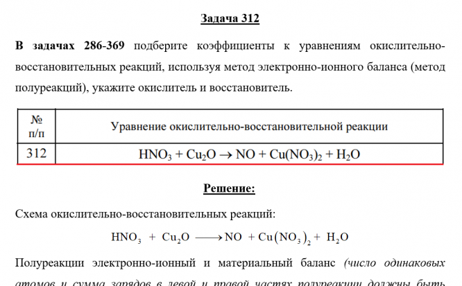 Задача 312 - подберите коэффициенты к уравнениям окислительно-восстановительных реакций, используя метод электронно-ионного баланса (метод полуреакций), укажите окислитель и восстановитель.