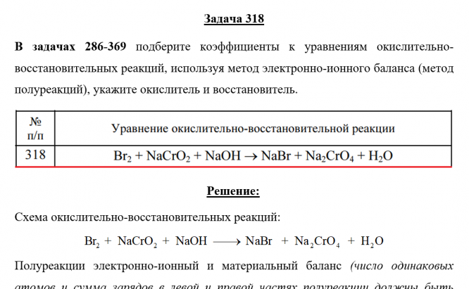 Главная » Учебные материалы » Химия » Решения задач » Несколько классов/семестров » Номер 318 » Задача 318 - подберите коэффициенты к уравнениям окислительно-восстановительных реакций, используя метод электронно-ионного баланса (метод полуреакций), укажите окислитель и восстановитель.