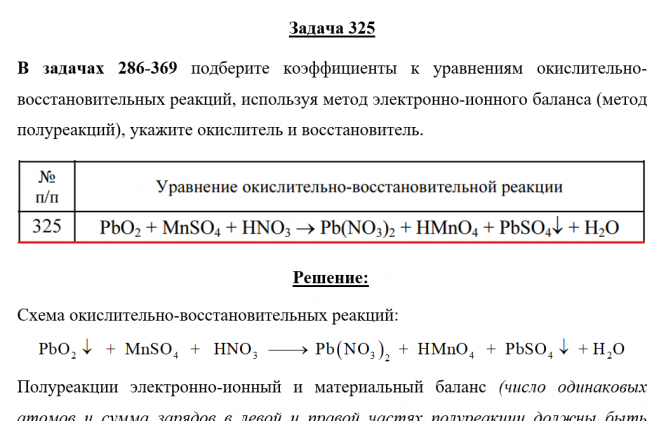 Для студентов по предмету ХимияЗадача 325 - подберите коэффициенты к уравнениям окислительно-восстановительных реакций, используя метод электронно-ионного баланса (метод полуреакцийЗадача 325 - подберите коэффициенты к уравнениям окислительно-восстановительных реакций, используя метод электронно-ионного баланса (метод полуреакций