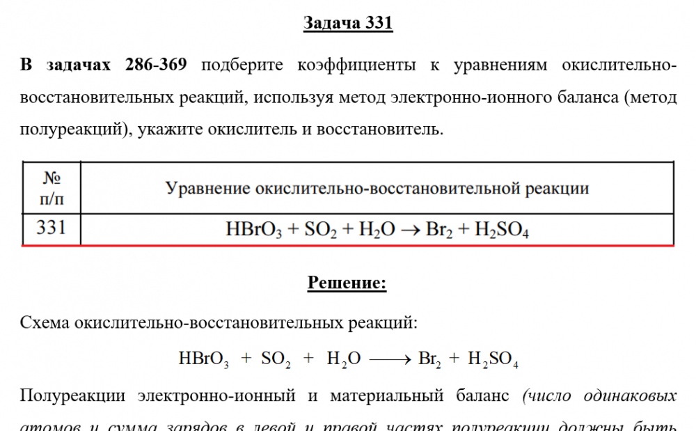 Задача 331 - подберите коэффициенты к уравнениям окислительно-восстановительных реакций, используя метод электронно-ионного баланса (метод полуреакций), укажите окислитель и восстановитель.