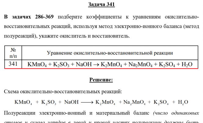 Задача 341 - подберите коэффициенты к уравнениям окислительно-восстановительных реакций, используя метод электронно-ионного баланса (метод полуреакций), укажите окислитель и восстановитель.