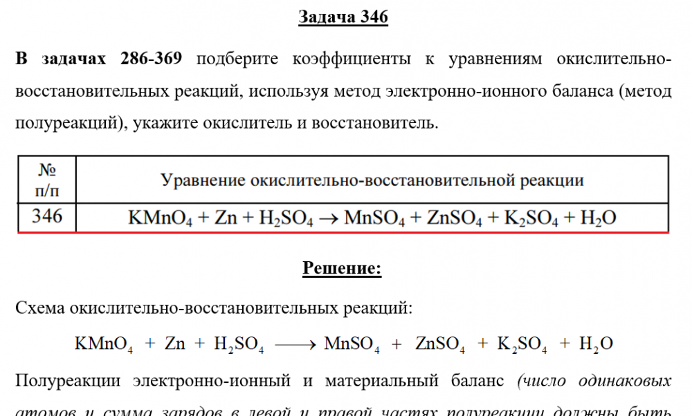 Для студентов по предмету ХимияЗадача 346 - подберите коэффициенты к уравнениям окислительно-восстановительных реакций, используя метод электронно-ионного баланса (метод полуреакцийЗадача 346 - подберите коэффициенты к уравнениям окислительно-восстановительных реакций, используя метод электронно-ионного баланса (метод полуреакций