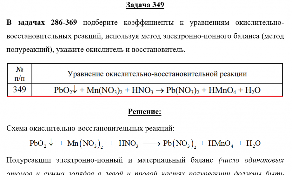 Для студентов по предмету ХимияЗадача 349 - подберите коэффициенты к уравнениям окислительно-восстановительных реакций, используя метод электронно-ионного баланса (метод полуреакцийЗадача 349 - подберите коэффициенты к уравнениям окислительно-восстановительных реакций, используя метод электронно-ионного баланса (метод полуреакций