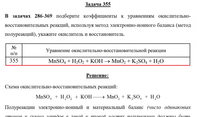 Для студентов по предмету ХимияЗадача 355 - подберите коэффициенты к уравнениям окислительно-восстановительных реакций, используя метод электронно-ионного баланса (метод полуреакцийЗадача 355 - подберите коэффициенты к уравнениям окислительно-восстановительных реакций, используя метод электронно-ионного баланса (метод полуреакций