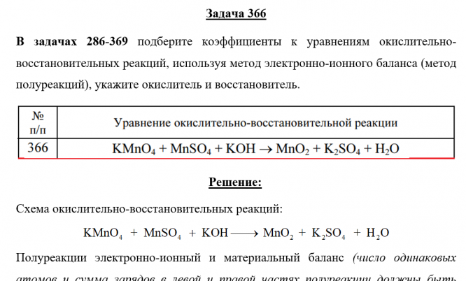Главная » Учебные материалы » Химия » Решения задач » Несколько классов/семестров » Номер 366 » Задача 366 - подберите коэффициенты к уравнениям окислительно-восстановительных реакций, используя метод электронно-ионного баланса (метод полуреакций), укажите окислитель и восстановитель.