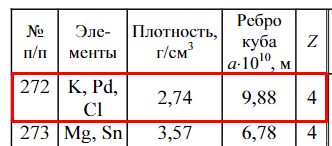 Главная » Учебные материалы » Химия » Решения задач » Несколько классов/семестров » Номер 272 » Определите формулу соединения, состоящего из указанных элементов, кристаллизующегося в кубической сингонии с известным числом формульных единиц Z в элементарной ячейке.