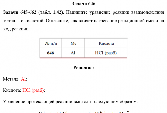 Задачи 645-662 (табл. 1.42). Напишите уравнение реакции взаимодействия металла с кислотой. Объясните, как влияет нагревание реакционной смеси на ход реакции.