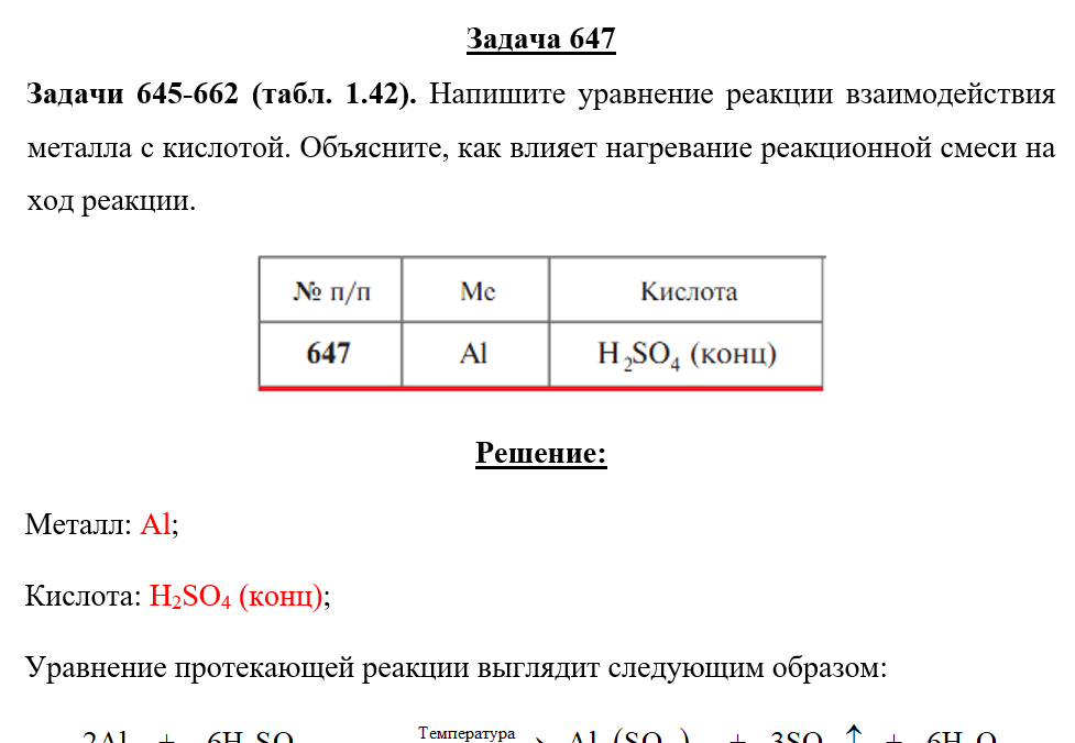 Задачи 645-662 (табл. 1.42). Напишите уравнение реакции взаимодействия металла с кислотой. Объясните, как влияет нагревание реакционной смеси на ход реакции.