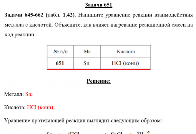 Задачи 645-662 (табл. 1.42). Напишите уравнение реакции взаимодействия металла с кислотой. Объясните, как влияет нагревание реакционной смеси на ход реакции.