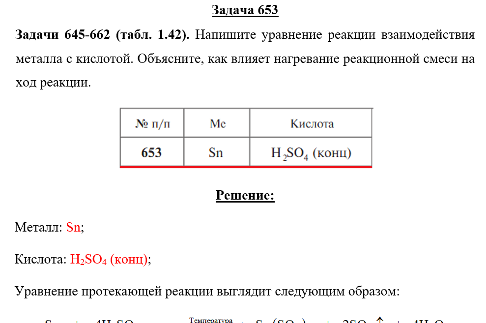 Задачи 645-662 (табл. 1.42). Напишите уравнение реакции взаимодействия металла с кислотой. Объясните, как влияет нагревание реакционной смеси на ход реакции.
