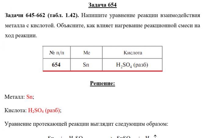 Задачи 645-662 (табл. 1.42). Напишите уравнение реакции взаимодействия металла с кислотой. Объясните, как влияет нагревание реакционной смеси на ход реакции.