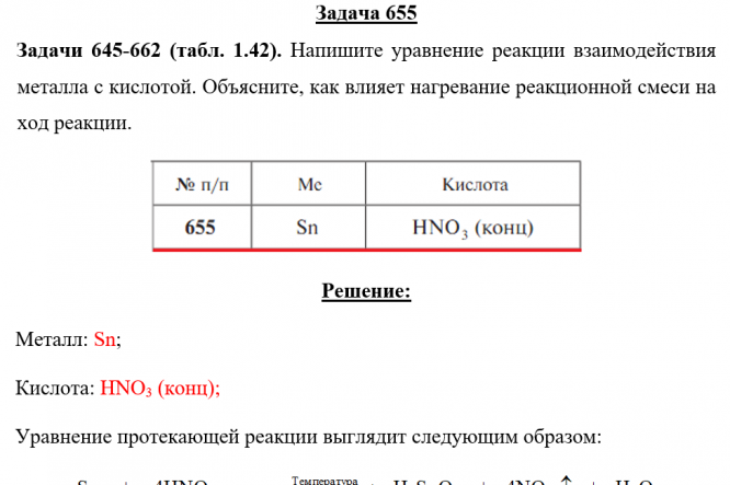 Задачи 645-662 (табл. 1.42). Напишите уравнение реакции взаимодействия металла с кислотой. Объясните, как влияет нагревание реакционной смеси на ход реакции.
