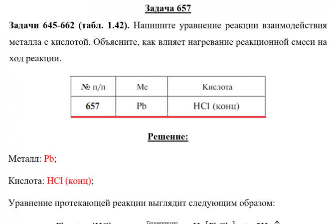Задачи 645-662 (табл. 1.42). Напишите уравнение реакции взаимодействия металла с кислотой. Объясните, как влияет нагревание реакционной смеси на ход реакции.