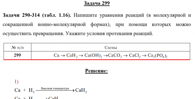 Главная » Учебные материалы » Химия » Решения задач » Несколько классов/семестров » Номер 299 » Задача 299 - Напишите уравнения реакций (в молекулярной и сокращенной ионно-молекулярной формах), при помощи которых можно осуществить превращения. Укажите условия протекания реакций.