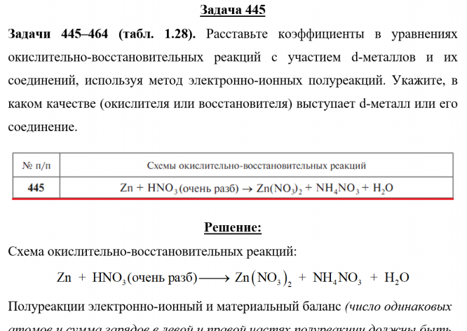 Задача 445 - Расставьте коэффициенты в уравнениях окислительно-восстановительных реакций с участием d-металлов и их соединений, используя метод электронно-ионных полуреакций. Укажите, в каком качестве (окислителя или восстановителя) выступает d-метал