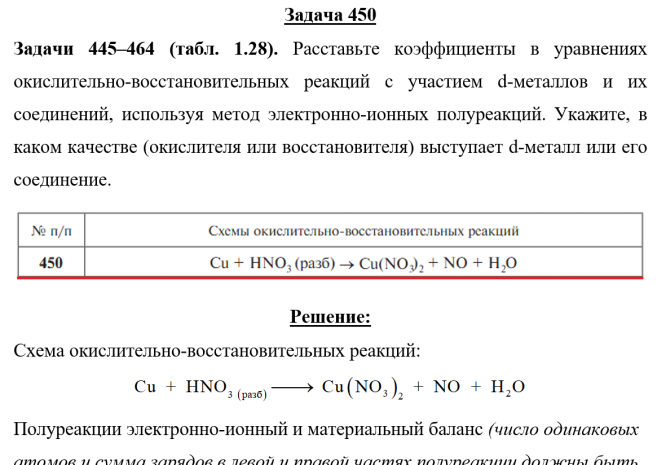 Задача 450 - Расставьте коэффициенты в уравнениях окислительно-восстановительных реакций с участием d-металлов и их соединений, используя метод электронно-ионных полуреакций. Укажите, в каком качестве (окислителя или восстановителя) выступает d-метал