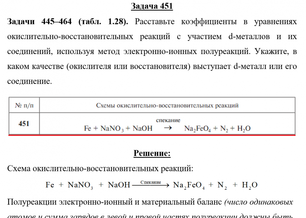 Задача 451 - Расставьте коэффициенты в уравнениях окислительно-восстановительных реакций с участием d-металлов и их соединений, используя метод электронно-ионных полуреакций. Укажите, в каком качестве (окислителя или восстановителя) выступает d-метал