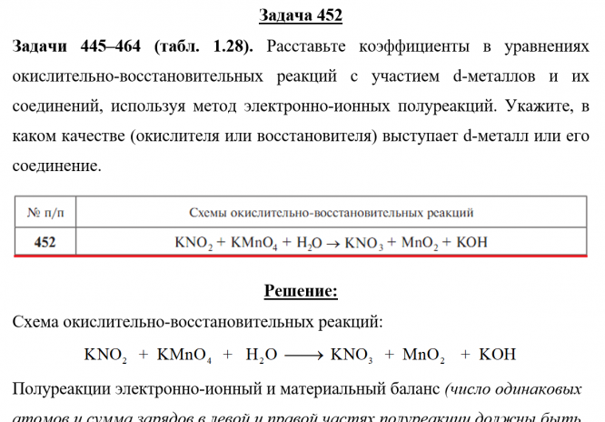 Задача 452 - Расставьте коэффициенты в уравнениях окислительно-восстановительных реакций с участием d-металлов и их соединений, используя метод электронно-ионных полуреакций. Укажите, в каком качестве (окислителя или восстановителя) выступает d-метал