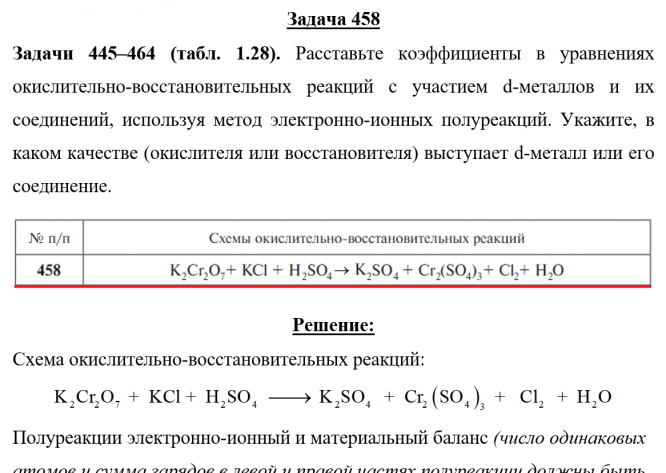 Задача 458 - Расставьте коэффициенты в уравнениях окислительно-восстановительных реакций с участием d-металлов и их соединений, используя метод электронно-ионных полуреакций. Укажите, в каком качестве (окислителя или восстановителя) выступает d-метал