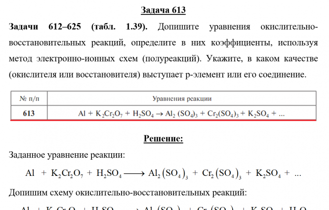 Задача 613 - Допишите уравнения окислительно-восстановительных реакций, определите в них коэффициенты, используя метод электронно-ионных схем (полуреакций). Укажите, в каком качестве (окислителя или восстановителя) выступает p-элемент или его соедине