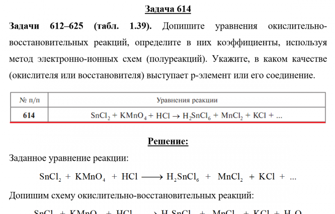 Задача 614 - Допишите уравнения окислительно-восстановительных реакций, определите в них коэффициенты, используя метод электронно-ионных схем (полуреакций). Укажите, в каком качестве (окислителя или восстановителя) выступает p-элемент или его соедине