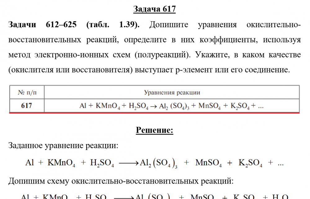 Задачи 612-625 (табл. 1.39). Допишите уравнения окислительно-восстановительных реакций, определите в них коэффициенты, используя метод электронно-ионных схем (полуреакций). Укажите, в каком качестве (окислителя или восстановителя) выступает p-элемент или его соединение.