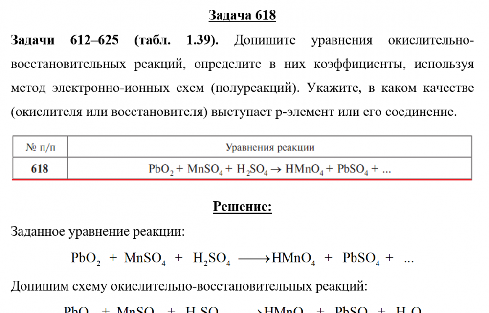 Задача 618 - Допишите уравнения окислительно-восстановительных реакций, определите в них коэффициенты, используя метод электронно-ионных схем (полуреакций). Укажите, в каком качестве (окислителя или восстановителя) выступает p-элемент или его соедине